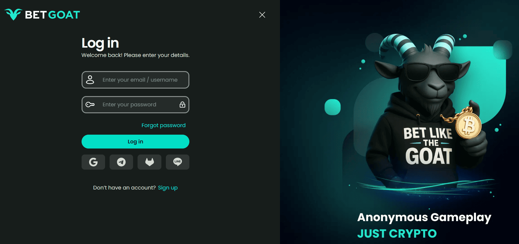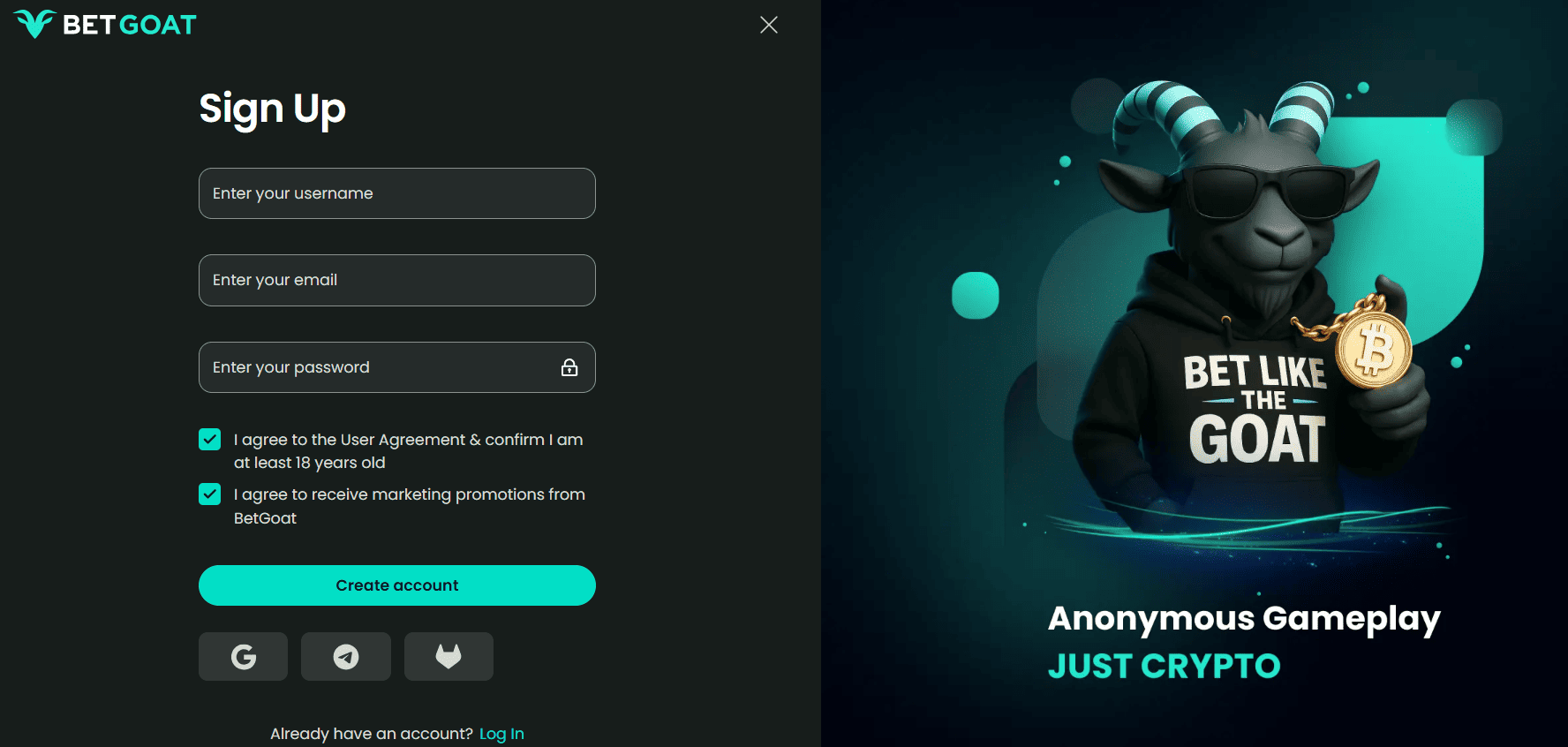BetGoat registration takes under 60 seconds and asks for two things: an email address and a username. No phone number. No date of birth at signup. No identity document before you can play. You’re in the casino lobby with access to the full game catalogue and sportsbook before you’ve deposited anything.